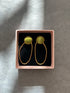 Les boucles d'oreilles ELIA sont composées d’une estampe dorée et d'un cabochon serti de tissu.